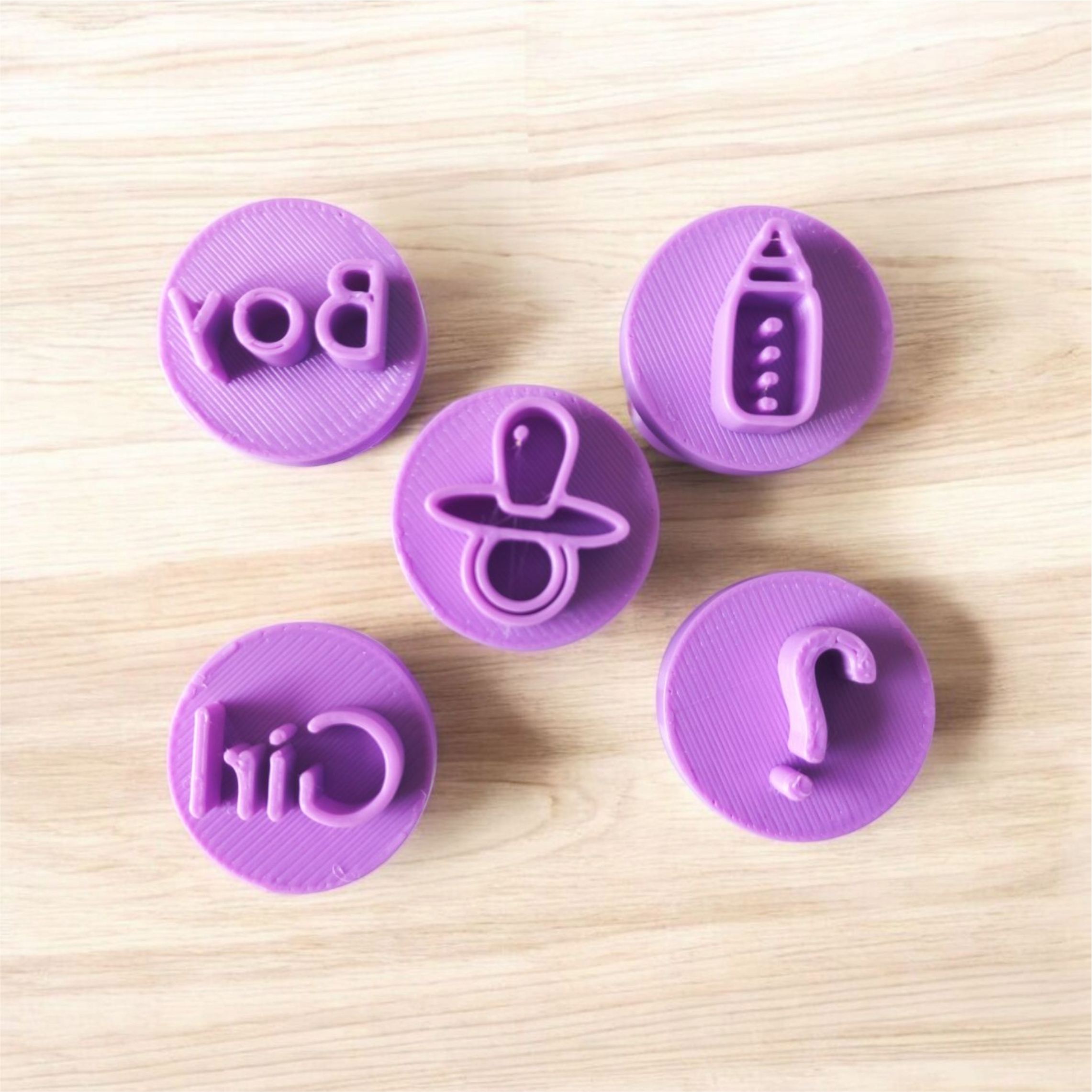 Kit composto por 5 carimbos, nos desenhos: Girl, Boy, Chupeta, Mamadeira e Interrogação.